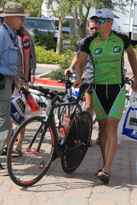 Plavání na pohodu – 25´C teplé jezero Las Vegas a v něm bójkami vymezen jeden okruh, resp. trať tam a zpět. Start v 06:30, tzn. pár minut po východu slunce. Podle předpokladu první disciplínu zvládl nejlépe Andy Potts za 23:19, druhý opouští jezero se ztrátou 30sek Collington a za dalších 30sekund vylézá Matthews následován cca 20 člennou skupinou roztaženo do půl minuty. Já jsem šel z vody na 5.místě, ale většinu plavecké tratě jsem odplaval na prvním místě skupiny, což pro mě nebyl problém. Hned po naskočení na kolo se skupina roztrhala a na 17.km, kdy sjela vedoucího Pottse čítala 7 závodníků (Gambles, Matthews, Alexander, Ambrose, M. Lieto, Collington a já). Za pár dalších kilometrů se kolem ní prohnal Tissink a poodjel. Naše skupina se do obrátky na 40.km rozrostla o Ch. Lieta, Cartmela a Bella. Prvních 40.km bylo po větru a převládaly kopce směrem nahoru než dolů. Mě se jelo super a hned po prvních metrech na kole, kdy na mě zakřičel Radek, že se v té skupině musím udržet, jsem jel podle toho. Do kopce jsem měl trochu navrch a tak jsem se vždy posunul na přední místa ve skupině, z kopce mě chyběl převod 53/11, tak jsem se většinou skupinou prosel dozadu. Na obrátce jsme zjistili, že zhruba 2minuty jede za námi další skupina cca 10 lidí. Na cestě zpět, jsem praktikoval to stejné co na obrátku – z kopce jsem ztrácel a doháněl to do kopce. Bohužel druhý delší výjezd se mi stal osudný – rozhodl jsem se, že předjedu více závodníku jedoucích za sebou a až na kopci se zařadím na pravou krajnici. Těsně před vrcholem se závodník, kterého jsem předjížděl, zvedl ze sedla a zrychlil. Takže jsem ho nepředjel, zařadil jsem se pár metrů za něj a přestal šlapat, aby rozestup mezi námi byl minimálně 8,5 metrů, jak stanovují pravidla. Rozhodčímu se však můj manévr nelíbil a vyfasoval jsem červenou kartu, tzn. 4minuty v penalty boxu. Tím pádem bylo po vyhlídkách na přední umístění…